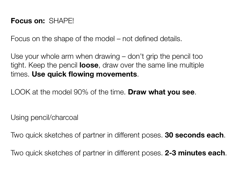Use your whole arm when drawing – don't grip the pencil too tight. Keep the pencil loose, draw over the same line multiple times. Use quick flowing movements.