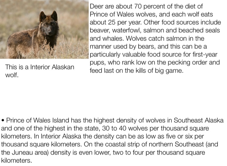 • Prince of Wales Island has the highest density of wolves in Southeast Alaska and one of the highest in the state, 30 to 40 wolves per thousand square kilometers. In Interior Alaska the density can be as low as five or six per thousand square kilometers. On the coastal strip of northern Southeast (and the Juneau area) density is even lower, two to four per thousand square kilometers.