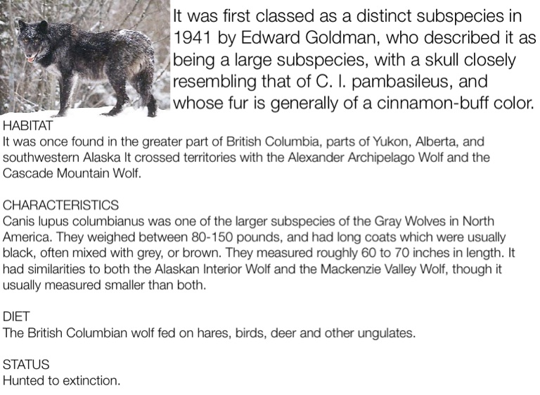 Canis lupus columbianus was one of the larger subspecies of the Gray Wolves in North America. They weighed between 80-150 pounds, and had long coats which were usually black, often mixed with grey, or brown. They measured roughly 60 to 70 inches in length. It had similarities to both the Alaskan Interior Wolf and the Mackenzie Valley Wolf, though it usually measured smaller than both.