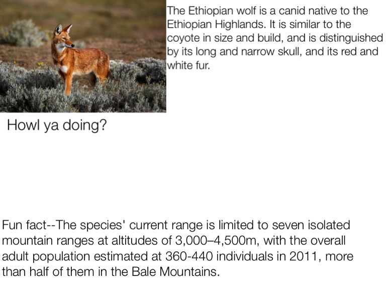 Fun fact--The species' current range is limited to seven isolated mountain ranges at altitudes of 3,000–4,500m, with the overall adult population estimated at 360-440 individuals in 2011, more than half of them in the Bale Mountains.