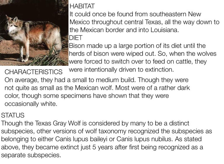 Though the Texas Gray Wolf is considered by many to be a distinct subspecies, other versions of wolf taxonomy recognized the subspecies as belonging to either Canis lupus baileyi or Canis lupus nubilus. As stated above, they became extinct just 5 years after first being recognized as a separate subspecies.
