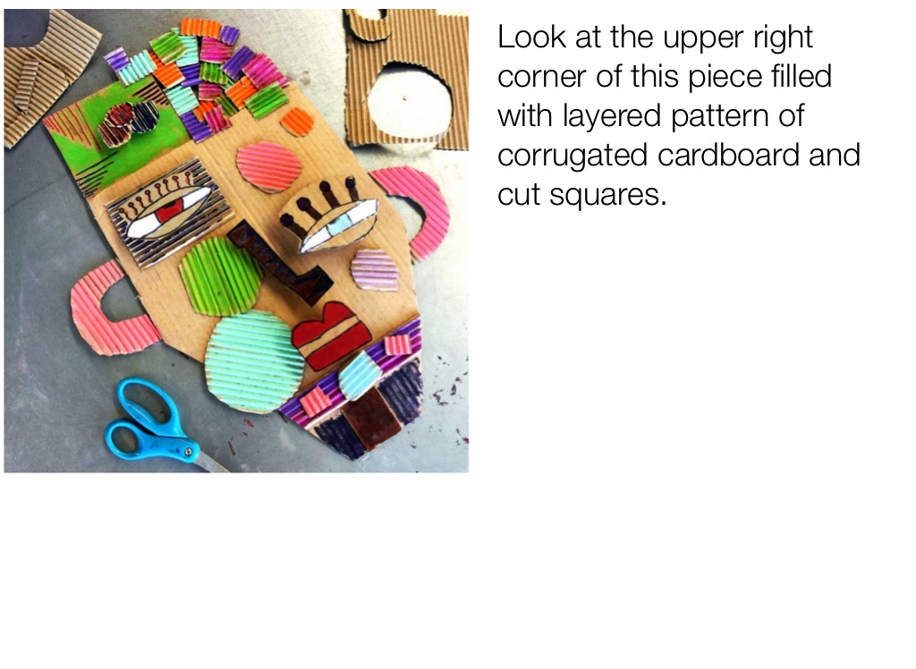 Look at the upper right corner of this piece filled with layered pattern of corrugated cardboard and cut squares.
