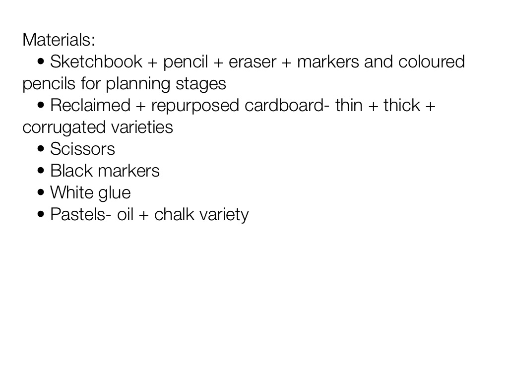 • Sketchbook + pencil + eraser + markers and coloured pencils for planning stages