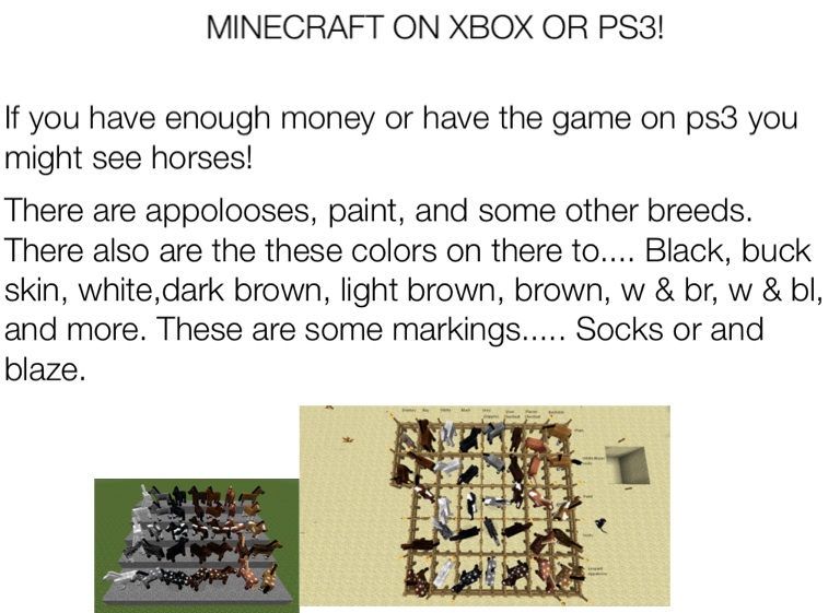 There are appolooses, paint, and some other breeds. There also are the these colors on there to.... Black, buck skin, white,dark brown, light brown, brown, w & br, w & bl, and more. These are some markings..... Socks or and blaze.