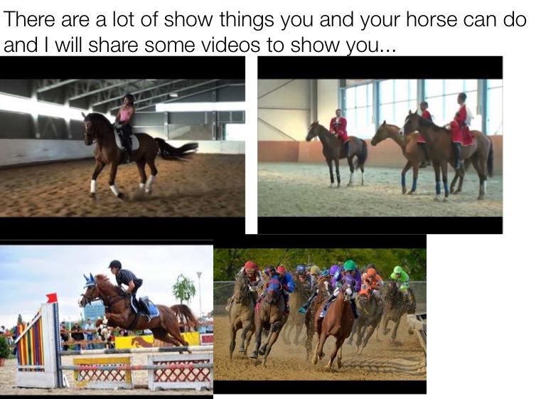 There are a lot of show things you and your horse can do and I will share some videos to show you...