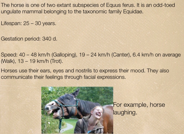 Speed: 40 – 48 km/h (Galloping), 19 – 24 km/h (Canter), 6.4 km/h on average (Walk), 13 – 19 km/h (Trot).