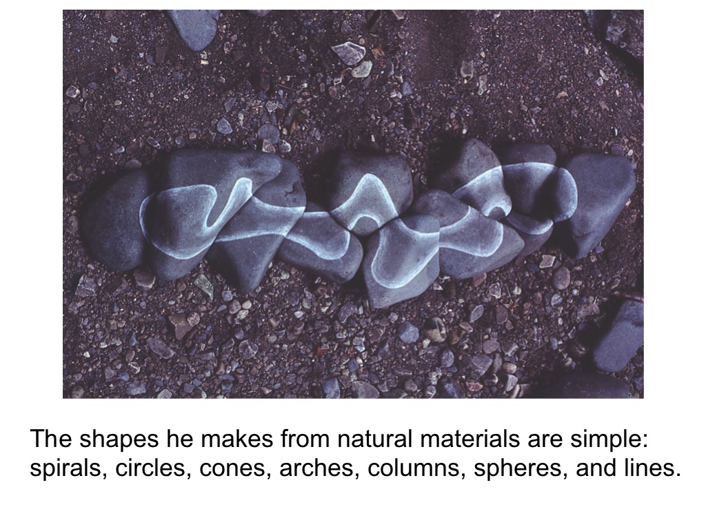 The shapes he makes from natural materials are simple: spirals, circles, cones, arches, columns, spheres, and lines.