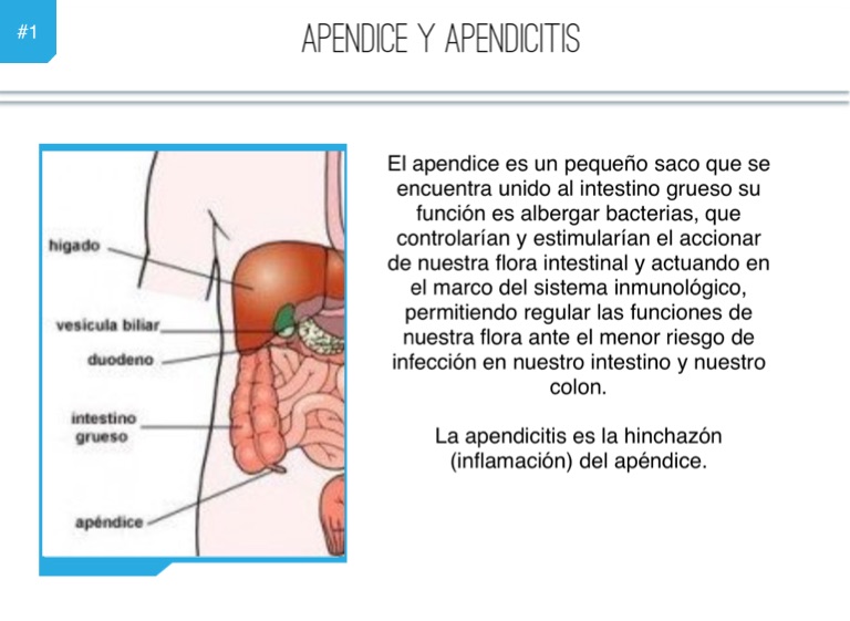 El apendice es un pequeño saco que se encuentra unido al intestino grueso su función es albergar bacterias, que controlarían y estimularían el accionar de nuestra flora intestinal y actuando en el marco del sistema inmunológico, permitiendo regular las funciones de nuestra flora ante el menor riesgo de infección en nuestro intestino y nuestro colon.